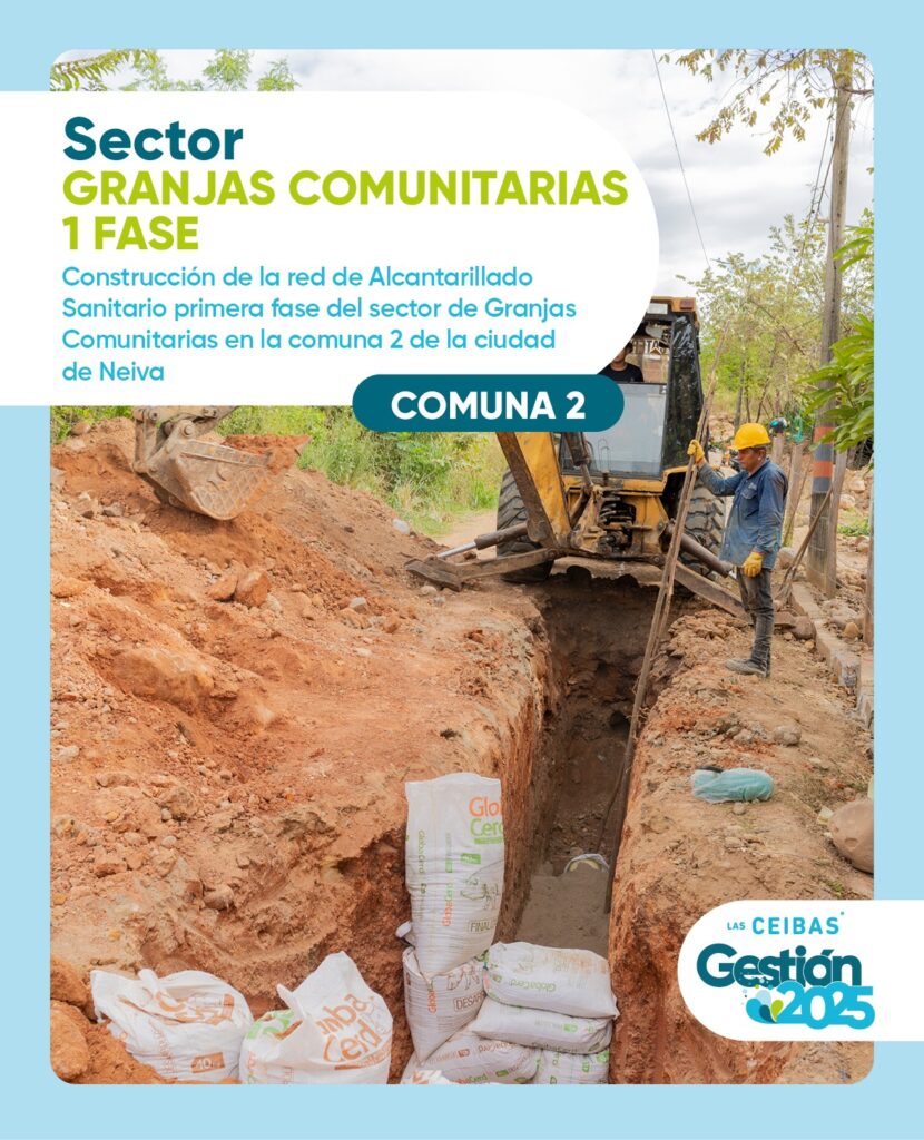 Adicionalmente, Las Ceibas Empresas Públicas de Neiva ejecutó la construcción de la red de alcantarillado sanitario, primera fase, en el sector de Granjas Comunitarias, comuna 2, ampliando la cobertura del servicio. Estas obras reflejan el compromiso de la empresa con el desarrollo urbano, la modernización de la infraestructura y el bienestar de los habitantes de Neiva.